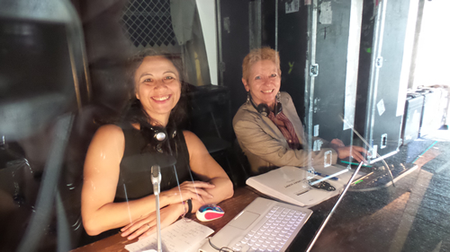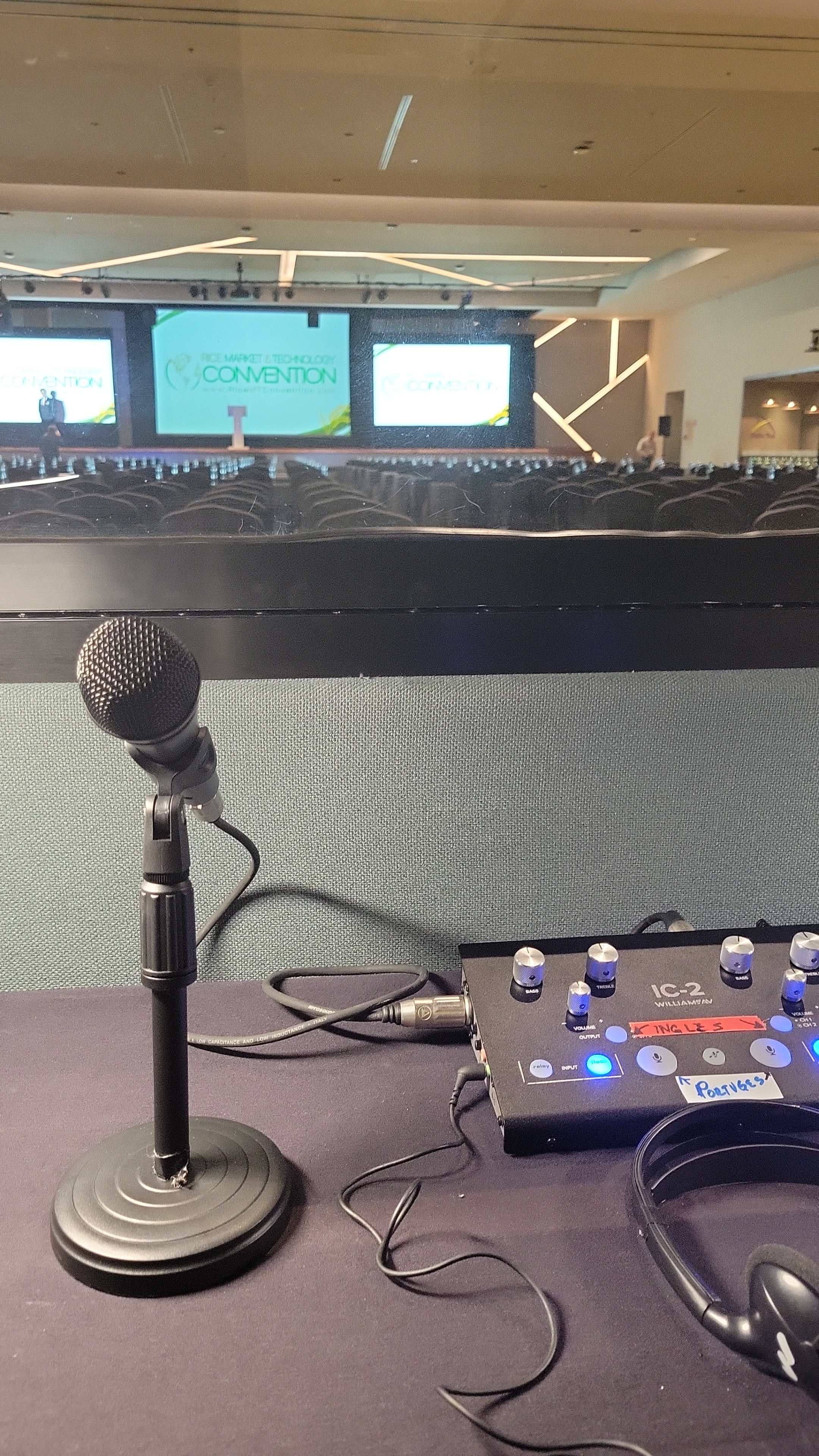 Set up at the back of the conference room, interpreters get a direct feed from the stage and their own mics.